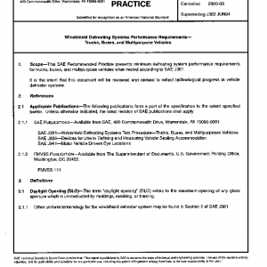 This SAE Recommended Practice presents minimum defrosting system performance requirements for trucks, buses, and multipurpose vehicles when tested according to SAE J381.