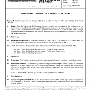 This SAE Recommended Practice outlines the static test procedure for the evaluation of the performance of seat belt anchorages attached to vehicle structure or to seat assemblies installed in the vehicle. (This SAE Recommended Practice supersedes the Test Procedure Section of SAE J787b.) Design recommendations and performance requirements are specified in the Recommended Practices SAE J383 and SAE J385, respectively.