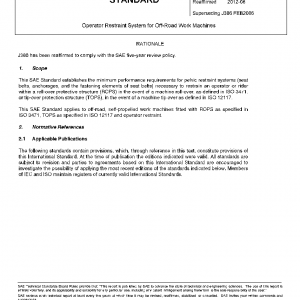 This SAE Standard applies to off-road, self-propelled work machines fitted with ROPS as specified in ISO 3471, TOPS as specified in ISO 12117 and operator restraint.