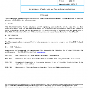 This SAE Recommended Practice establishes uniform engineering nomenclature for wheels, hubs, rims, and their components used in truck, bus, and trailer applications. This nomenclature and accompanying drawings are intended to define functional truck wheel, hub, and rim designs. For nomenclature specific to “passenger-type” disc wheels, refer to SAE J1982. The International Standard (ISO) nomenclature is shown in parentheses when different than SAE J393.