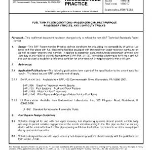 This SAE Recommended Practice defines conditions for evaluating the compatibility of vehicle fuel tanks and filler pipes with fuel dispensing facilities equipped with standard (non-vapor recovery) configuration as well as vapor recovery type nozzles. It applies to passenger cars, multipurpose passenger vehicles, and light-duty trucks 4536 kg (10 000 lb) maximum GVW (Ref. J1100). It includes a technique for filling a tank full that can be used to establish a reference condition for other tests which require starting with a full tank.