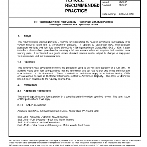 This recommended practice provides a method for establishing the rated or advertised fuel capacity for a vehicle utilizing liquid fuel at atmospheric pressure. It applies to passenger cars, multi-purpose passenger vehicles and light duty trucks (10 000 lb (4536 kg) maximum GVW), (Ref. SAE J1100). It also includes a standardized procedure for creating a full tank when another test requires that condition as a starting point. It is intended as a guide toward standard practice and is subject to change to keep pace with experience and technical advances.