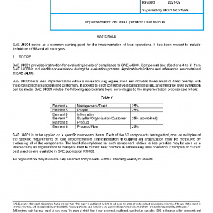 SAE J4000 tests lean implementation within a manufacturing organization and includes those areas of direct overlap with the organization’s suppliers and customers. If applied to each consecutive organizational link, an enterprise level evaluation can be made. SAE J4001 relates the following approximate topic percentages to the implementation process as a whole: