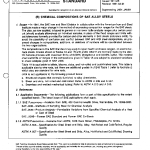 In 1941, the SAE Iron and Steel Division in collaboration with the American Iron and Steel Institute made a major change in the method of expressing composition ranges for the SAE steels. The plan, as now applied, is based in general on narrower ladle analysis ranges plus certain product (check) analysis allowances on individual samples, in place of the fixed ranges and limits without tolerances formerly provided for carbon and other elements in SAE steels (reference J408). To avoid the possibility of confusion and conflict between SAE and AISI steel designations, all proposed changes in compositions, additions, or deletions of numbers will be coordinated between the two organizations.