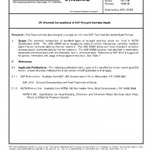 The chemical composition of standard types of wrought stainless steels are listed in ASTM Specification A240. The UNS 20000 series designates nickel-chromium manganese, corrosion resistant types that are nonhardenable by thermal treatment. The UNS 30000 series are nickel-chromium, corrosion resistant steels, nonhardenable by thermal treatment. The UNS 40000 however, includes both a hardenable, martensitic chromium steel and nonhardenable, ferritic, chromium steel. Reference to SAE J412 is suggested for general information and usage of these types of materials. See Table 1.