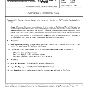 (These definitions were prepared by the Joint Committee on Definitions of Terms Relating to Heat Treatment appointed by the American Society for Testing and Materials, The American Society for Metals, the American Foundrymen’s Association, and the SAE.) This SAE revision emphasizes the terms used in heat treating ferrous alloys, but also includes for reference some non-ferrous definitions at the end of the document.