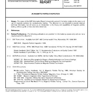 The scope of this SAE Information Report is to provide general information relative to the nature and use of magnetic particles for nondestructive testing. The document is not intended to provide detailed technical information, but will serve as an introduction to the theory and capabilities of magnetic particle testing, and as a guide to more extensive references.
