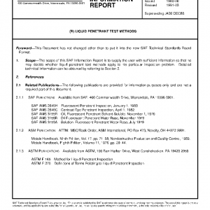 The scope of this SAE Information Report is to supply the user with sufficient information so that he may decide whether liquid penetrant test methods apply to his particular inspection problem. Detailed technical information can be obtained by referring to Section 2.