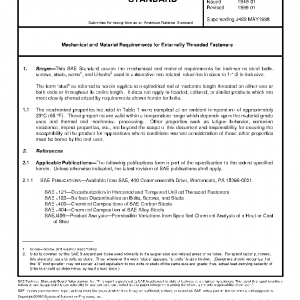 This SAE Standard covers the mechanical and material requirements for inch-series steel bolts, screws, studs, sems1, and U-bolts2 used in automotive and related industries in sizes to 1-1/2 in inclusive.