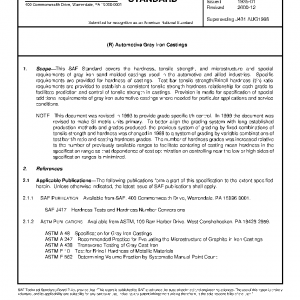 This SAE Standard covers the hardness, tensile strength, and microstructure and special requirements of gray iron sand molded castings used in the automotive and allied industries. Specific requirements are provided for hardness of castings. Test bar tensile strength/Brinell hardness (t/h) ratio requirements are provided to establish a consistent tensile strength-hardness relationship for each grade to facilitate prediction and control of tensile strength in castings. Provision is made for specification of special additional requirements of gray iron automotive castings where needed for particular applications and service conditions.