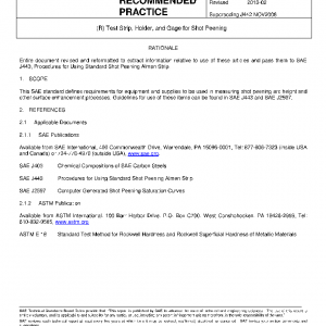 This SAE standard defines requirements for equipment and supplies to be used in measuring shot peening arc height and other surface enhancement processes. Guidelines for use of these items can be found in SAE J443 and SAE J2597.