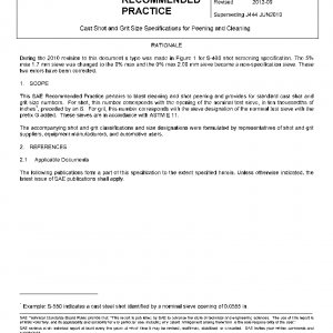 This SAE Recommended Practice pertains to blast cleaning and shot peening and provides for standard cast shot and grit size numbers. For shot, this number corresponds with the opening of the nominal test sieve, in ten thousandths of inches1, preceded by an S. For grit, this number corresponds with the sieve designation of the nominal test sieve with the prefix G added. These sieves are in accordance with ASTM E 11.