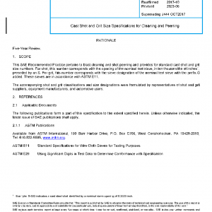 This SAE Recommended Practice pertains to blast cleaning and shot peening and provides for standard cast shot and grit size numbers. For shot, this number corresponds with the opening of the nominal test sieve, in ten thousandths of inches1, preceded by an S. For grit, this number corresponds with the sieve designation of the nominal test sieve with the prefix G added. These sieves are in accordance with ASTM E11.