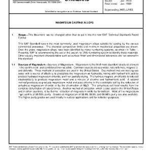This SAE Standard covers the most commonly used magnesium alloys suitable for casting by the various commercial processes. The chemical composition limits and minimum mechanical properties are shown. Over the years, magnesium alloys have been identified by many numbering systems, as shown in Table 1. Presently, SAE is recommending the use of the use of the UNS numbering system to identify those materials. Other equally important characteristics such as surface finish and dimensional tolerances are not covered in this standard.
