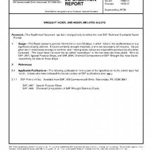 This Report presents general information on over 50 alloys in which nickel either predominates or is a significant alloying element. It covers primarily wrought materials, and is not necessarily all inclusive. Values given are in most cases average or nominal, and if more precise values are required the producer(s) should be contacted. This report does not cover the so-called “superalloys,” or the iron base stainless steels. Refer to SAE J467, Special Purpose Alloys, and SAE J405, Chemical Compositions of SAE Wrought Stainless Steels, respectively, for data on these alloys.