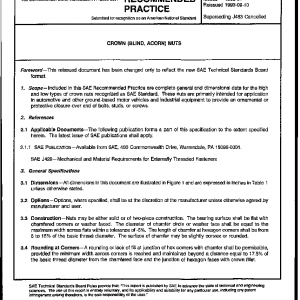 Included in this SAE Recommended Practice are complete general and dimensional data for the high and low types of crown nuts recognized as SAE Standard. These nuts are primarily intended for application in automotive and other ground-based motor vehicles and industrial equipment to provide an ornamental or protective closure over end of bolts, studs, or screws.