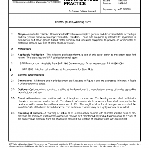 Included in this SAE Recommended Practice are complete general and dimensional data for the high and low types of crown nuts recognized as SAE Standard. These nuts are primarily intended for application in automotive and other ground-based motor vehicles and industrial equipment to provide an ornamental or protective closure over end of bolts, studs, or screws.