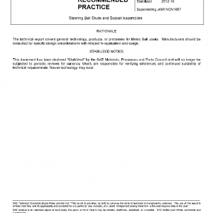 This SAE Recommended Practice has been established for the purpose of providing design criteria and suggested dimensional proportions which may be used for ball studs and ball stud socket assemblies as used on steering systems or control mechanisms of passenger vehicles, trucks and off-road equipment.