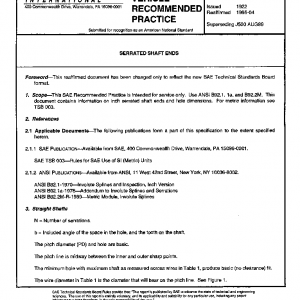 This SAE Recommended Practice is intended for service only. Use ANSI B92.1, 1a, and B92.2M. This document contains information on inch serrated shaft ends and hole dimensions. For metric information see TSB 003.