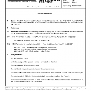 This SAE Recommended Practice is intended for service only. Use ANSI B92.1, 1a, and B92.2M. This document contains information on inch serrated shaft ends and hole dimensions. For metric information, see TSB 003.