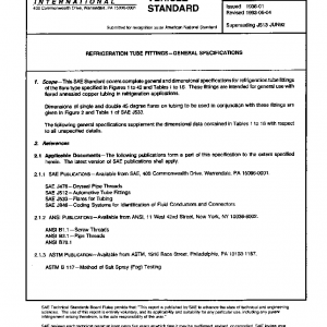 This SAE Standard covers complete general and dimensional specifications for refrigeration tube fittings of the flare type specified in Figures 1 to 42 and Tables 1 to 16. These fittings are intended for general use with flared annealed copper tubing in refrigeration applications.