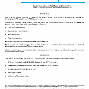 This part of SAE J514 covers general and dimensional specifications for NPTF pipe adapters and 30 degree NPSM adapter unions. These fittings are intended for general application in hydraulic systems on industrial equipment and commercial products.