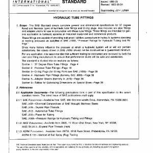 This SAE Standard covers complete general and dimensional specifications for 37 degree flared and flareless types of hydraulic tube fittings and O-ring plugs. Also included are pipe fittings and adapter unions for use in conjunction with these tube fittings. These fittings are intended for general application in hydraulic systems on industrial equipment and commercial products.