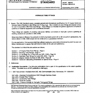 This SAE Standard covers complete general and dimensional specifications for 37 degree flared and flareless types of hydraulic tube fittings and O-ring plugs. Also included are pipe fittings and adapter unions for use in conjunction with these tube fittings. These fittings are intended for general application in hydraulic systems on industrial equipment and commercial products.