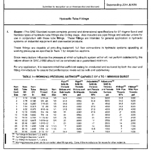 This SAE Standard covers complete general and dimensional specifications for 37 degree flared and flareless types of hydraulic tube fittings and O-ring plugs. Also included are pipe fittings and adapter unions for use in conjunction with these tube fittings. These fittings are intended for general application in hydraulic systems on industrial equipment and commercial products.