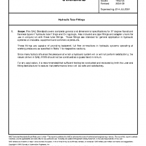 This SAE Standard covers complete general and dimensional specifications for 37 degree flared and flareless types of hydraulic tube fittings and O-ring plugs. Also included are pipe fittings and adapter unions for use in conjunction with these tube fittings. These fittings are intended for general application in hydraulic systems on industrial equipment and commercial products.