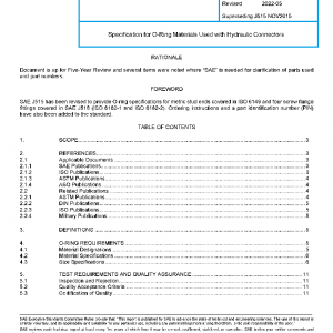 SAE J515 covers the specification for hydraulic O-ring material and properties and sizes applicable to face seal fittings, metric and inch stud ends, and four-bolt flange fittings. The standard includes a size code to allow industry and government agencies to order O-rings with a coded part number.