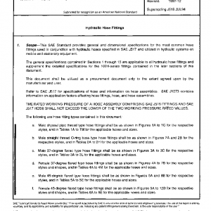 This SAE Standard provides general and dimensional specifications for the most common hose fittings used in conjunction with hydraulic hoses specified in SAE J517 and utilized in hydraulic systems on mobile and stationary equipment.