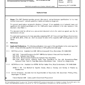 This SAE Standard provides general, dimensional, and performance specifications for the most common hoses used in hydraulic systems on mobile and stationary equipment.