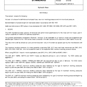 This SAE Standard provides general, dimensional and performance specifications for the most common hoses used in hydraulic systems on mobile and stationary equipment.