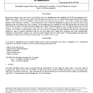 This SAE Standard covers general and dimensional specifications for the Code 62 metric (type 1) and inch (type 2) flanged heads, flange clamps (FC and FCM), and split flange clamps (FCS & FCSM) applicable to four-screw flange type tube, pipe, and hose connections. Also included are the recommended port dimensions and port design considerations. Type 2 (inch) flange clamps and split flanges are not for new design.