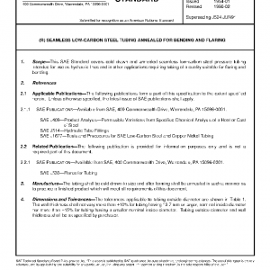 This SAE Standard covers cold drawn and annealed seamless low-carbon steel pressure tubing intended for use as hydraulic lines and in other applications requiring tubing of a quality suitable for flaring and bending.