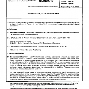 This SAE Standard includes complete general and dimensional specifications for those types of pipe, filler, and drain plugs (shown in Figures 1 to 6 and Tables 1 to 4) commonly used in automotive and related industrial applications.