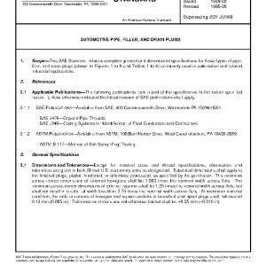 This SAE Standard includes complete general and dimensional specifications for those types of pipe, filler, and drain plugs (shown in Figures 1 to 6 and Tables 1 to 4) commonly used in automotive and related industrial applications.