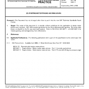 The scope of this document is to provide uniform guidelines for the application of starter motor pinions and ring gears. SAE J543 contains guidelines for the use of diametral pitch gearing. The pinion data shown are based on the Fellows stub tooth system. Refer to ISO 8123, ISO 9457-1, and ISO 9457-2 for module gearing, and corresponding metric dimensions.