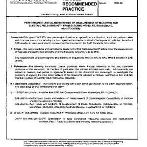 The test procedures and performance levels in this SAE Recommended Practice cover the measurement of magnetic and electric field strengths over the frequency range 9 kHz to 30 MHz.