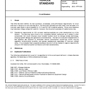 This SAE Standard defines the test conditions, procedures, and performance requirements for circuit breakers in ratings up to and including 50 A. The document includes automatic reset, modified reset, and manually reset types of circuit breakers for 12 V and 24 V DC electrical systems. Some circuit breakers may have dual voltage ratings (AC and DC), however, this document evaluates DC performance only.