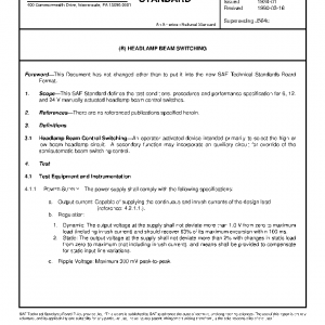 This SAE Standard defines the test conditions, procedures and performance specification for 6, 12, and 24 V manually actuated headlamp beam control switches.