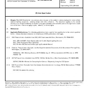 This SAE Standard defines and provides a means for the control of colors employed in motor vehicle external lighting equipment, including lamps and reflex reflectors. The document applies to the overall effective color of light emitted by the device in any given direction and not to the color of the light from a small area of the lens. It does not apply to pilot, indicator, or tell-tale lights.
