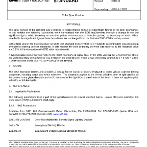 This SAE Standard defines and provides a means for the control of colors employed in motor vehicle external lighting equipment, including lamps and reflex reflectors. The document applies to the overall effective color of light emitted by the device in any given direction and not to the color of the light from a small area of the lens. It does not apply to pilot, indicator, or tell-tale lights.