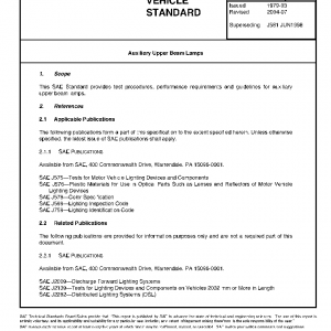 This SAE Standard provides test procedures, performance requirements and guidelines for auxiliary upper beam lamps.