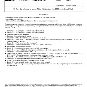 This SAE Standard provides test procedures, requirements, and guidelines for turn signal lamps intended for use on vehicles of less than 2032 mm in overall width.