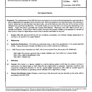 This SAE Standard defines the test conditions, procedures, and minimum design requirements for nominal 6, 12, and 24 V turn signal flashers.