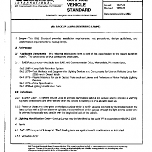 This SAE Standard provides installation requirements, test procedures, design guidelines, and performance requirements for backup lamps.