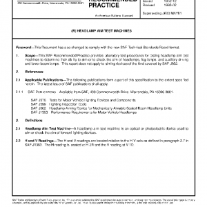 This SAE Recommended Practice provides laboratory test procedures for testing headlamp aim test machines to determine their ability to aim or to check the aim of headlamps, fog lamps, and auxiliary driving and lower beam lamps. This report does not apply to aiming devices of the kind covered by SAE J602.