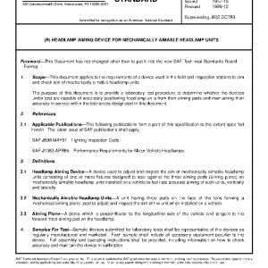The purpose of this document is to provide a laboratory test procedure to determine whether the devices under test are capable of accurately positioning headlamp units from their aiming pads and maintaining their accuracy in service within the tolerances designated in this document.